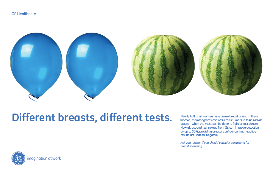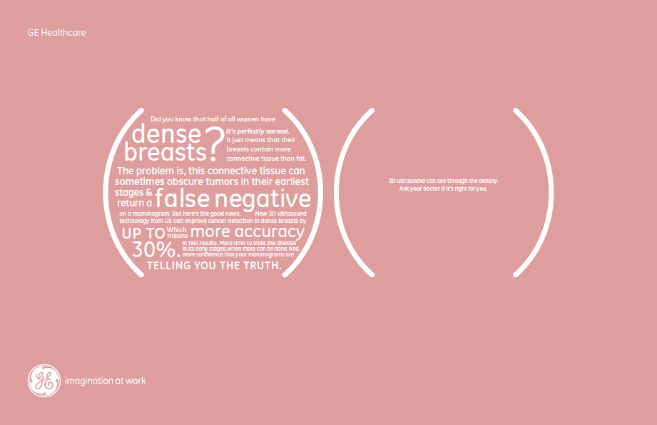 GE Healthcare 3D ultrasound technology helps women achieve more accurate mammogram results. To help get the word out, I devised and wrote these ad concepts. In one day.