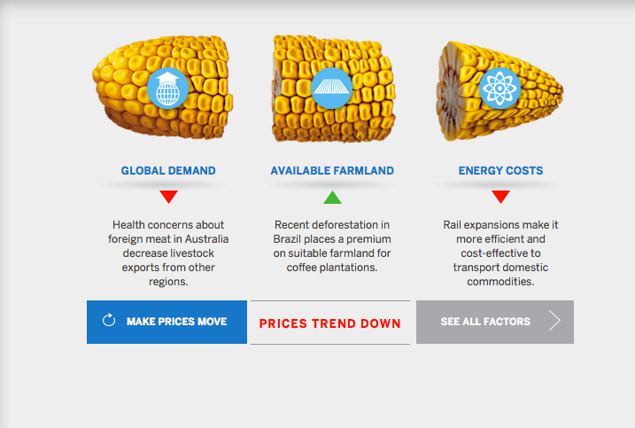Detail of the food prices infographic. Users can click to change the price factors and see how they go up or down.