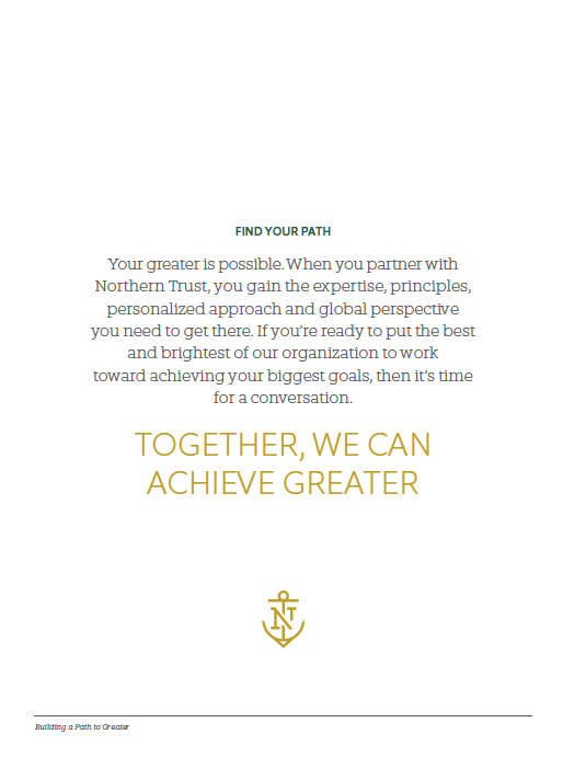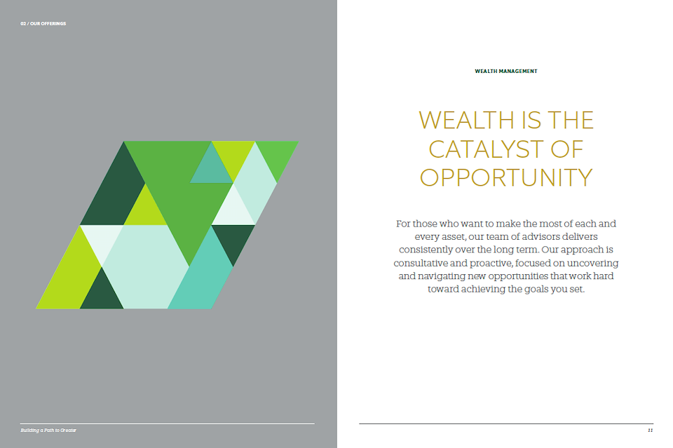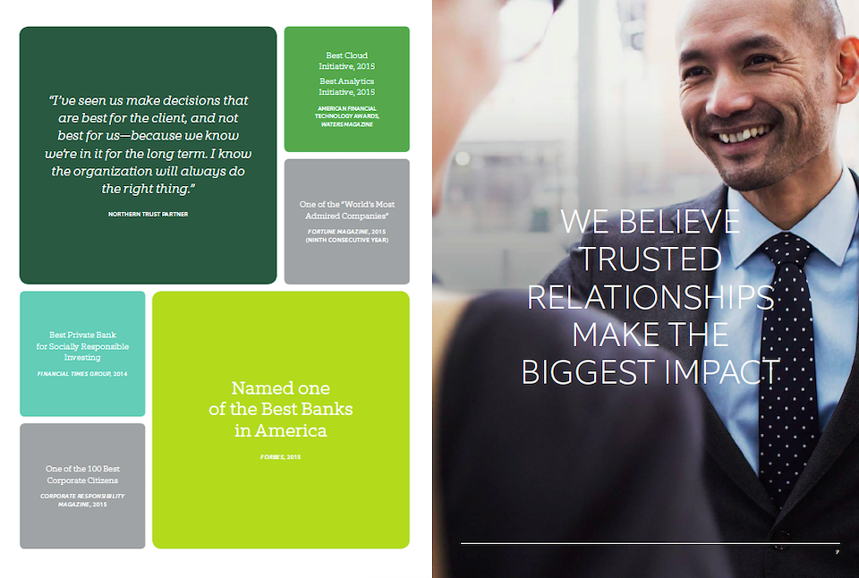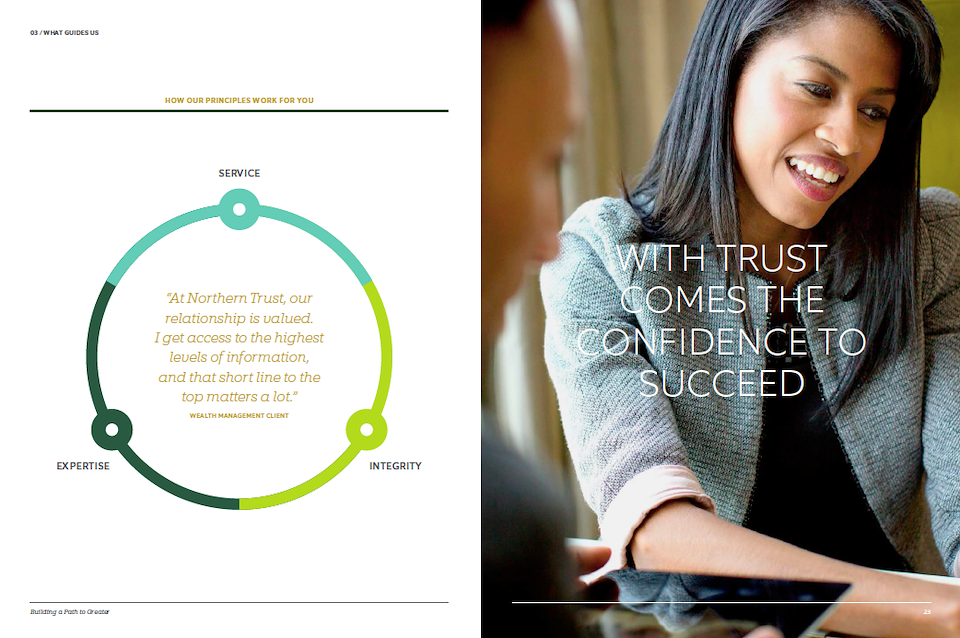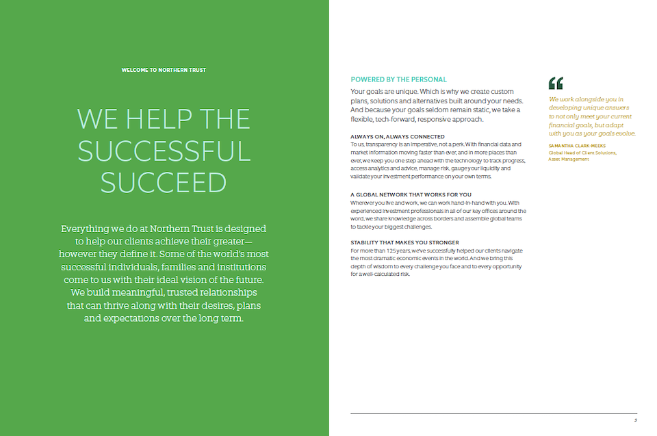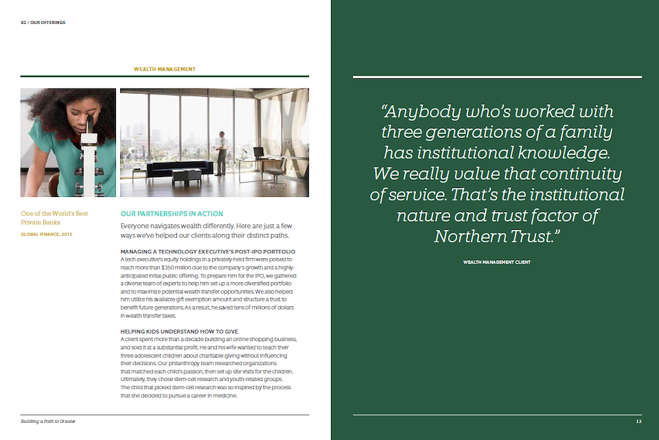 These are a few spreads from the long-form corporate brochure for Northern Trust. They’d just established a new brand centered around the idea of “Achieve Greater.” This brochure was the first piece of the new literature system aimed at unifying their offerings and mission under their new brand.
