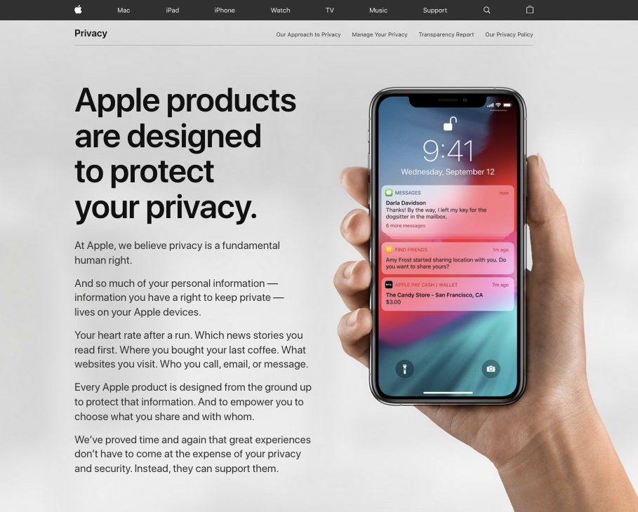The Apple Values section on apple.com shares the company’s perspectives on privacy, education, accessibility, the environment, and more. When the Privacy page was due for a redesign, I worked closely with Apple’s creative team and privacy experts to write the new web copy.